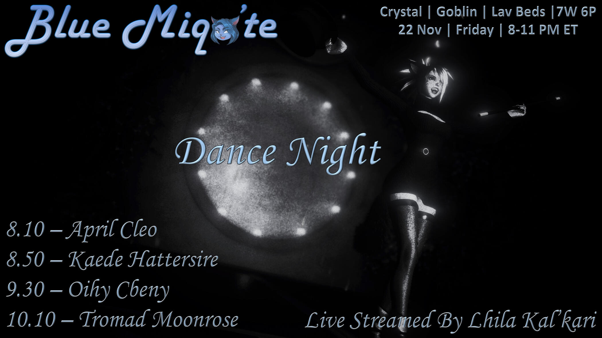 The Blue Miqo'te is a long-standing music and roleplay venue in Final Fantasy XIV, based on the Goblin server. Originally opened on January 3, 2020 as a jazz-themed tavern, it has since evolved to feature a variety of performance styles and genres. Whether you're after a chill hangout or energetic entertainment, The Blue Miqo'te offers a welcoming space for all.Special Note: As of 10 January 2025, the Blue Miqo'te will be open for special events only. If you'd like to schedule an event, please reach out to Tromad Lunakith via Discord.Update: As of April 2025, the Blue Miqo'te will also function as an FC for casual players and alts.Follow us on Discord for more information.